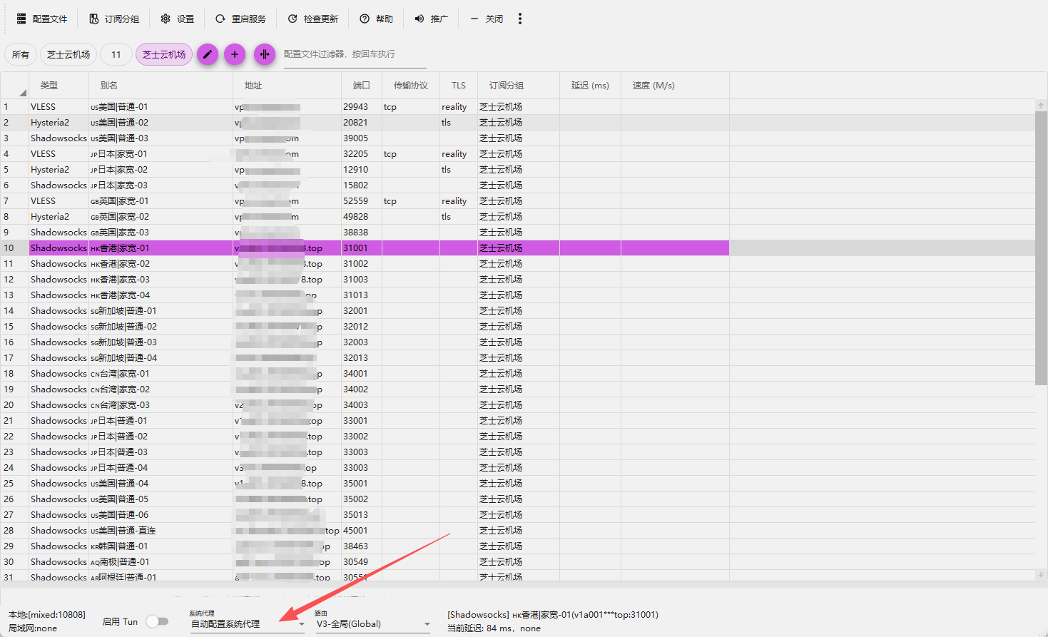 选择任意一个节点后按回车键确认,并将系统代理改为 自动配置系统代理