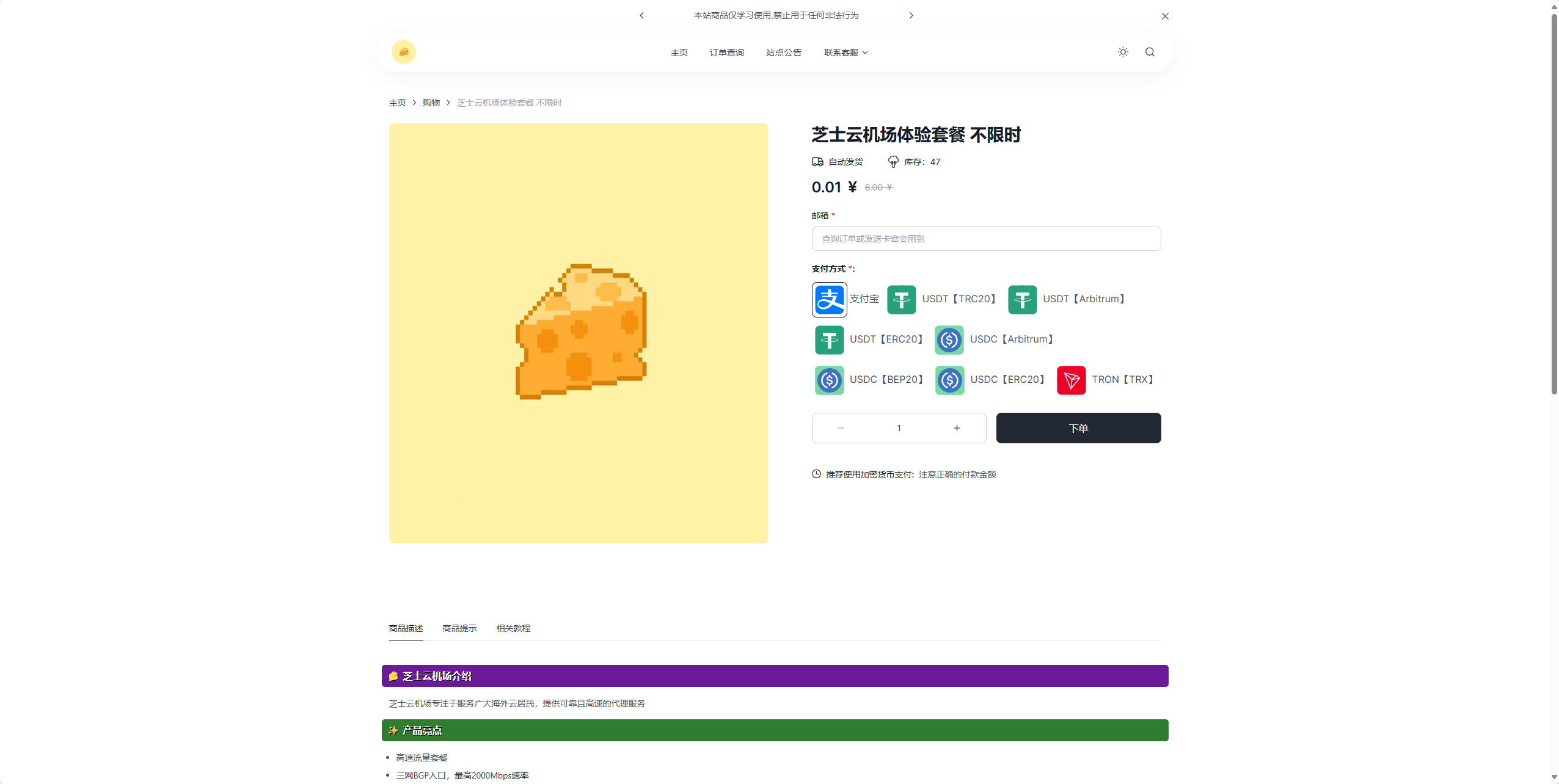 在这里本站为大家提供1分钱即可使用的套餐:芝士云机场体验套餐【为了防止恶意批量下单库存,只能设置1分钱来杜绝此情况】